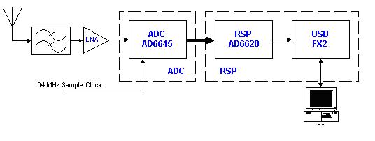 The RF signal from the antenna is sampled after filtering and amplification with a high speed analog to digital converter (ADC) AD6645 from Analog Devices. The sample rate is 64M samples per second. The receive signal processor (RSP) is the Analog Devices AD6620, and it performs digital mixing of the RF signal to base band, decimation of the sample rate and digital filtering. The samples from the RSP are transferred to a PC via USB. A Cypress USB FX2 supports USB communication. The main signal processing is performed on the PC.
