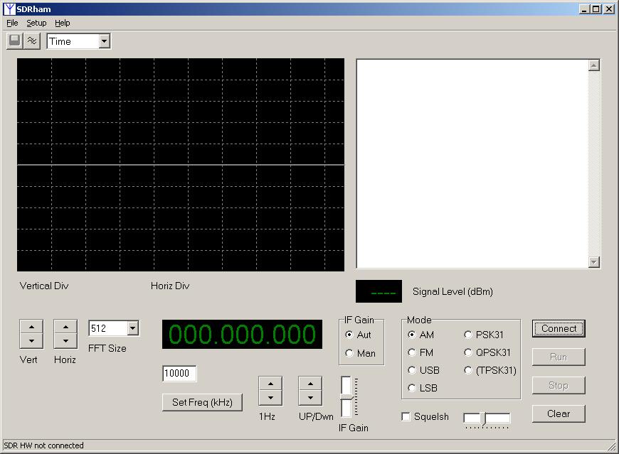 Figure 3 shows the SDRham test application user interface. The left window shows signals in the time or the frequency domain. The right window is intended to display text from data modes as PSK31.