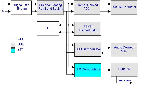 Figure 4 shows the SDRham signal processing software, where the colour of the blocks indicates the instruction units of the Pentium processor used. GPR is the general purpose register unit , x87 is the math floating point one and SSE is multimedia instruction unit.
